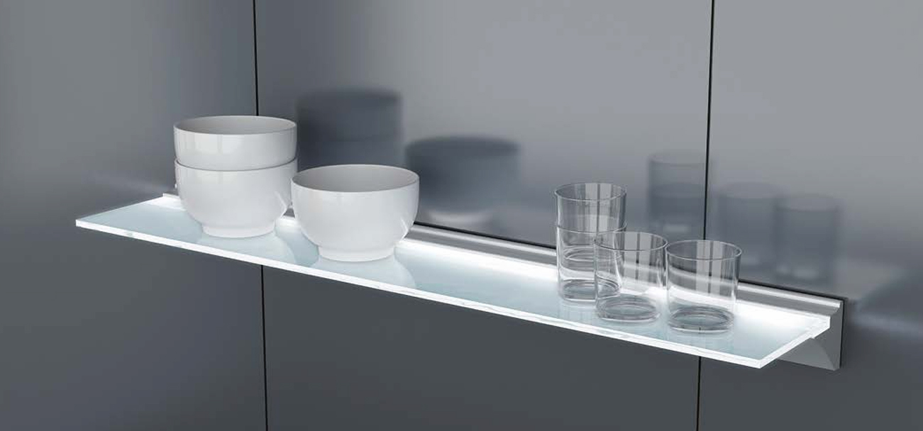 Los LEDs del interior del estante se reflejan sobre el cristal al acido de 8 mm de espesor. El resultado de este efecto visual en el cristal es un toque diferente que ayuda a crear un un ambiente único y diferente